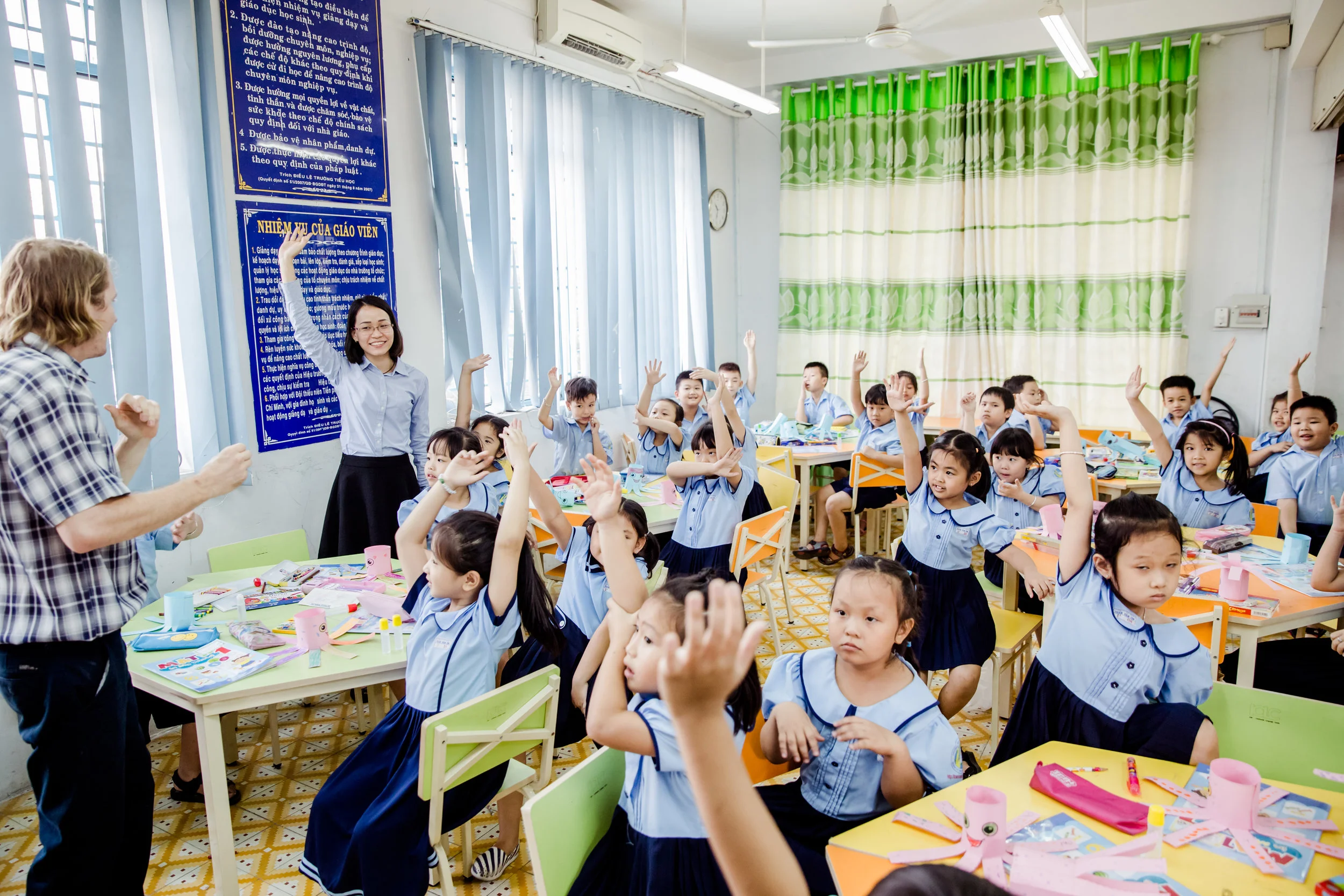 Size: The average size of classrooms ranges from 40-60 students. Additionally, there is one Vietnamese teacher per academic class.